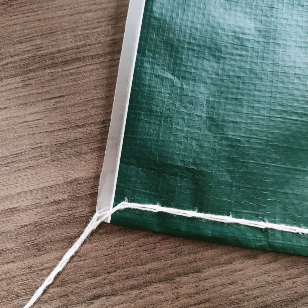 - Tape-Over-Sew: In this method, a strip of woven tape (usually 50–60 mm wide, PP-based) is laid over the folded mouth before stitching. The needle then sews through both the bag and the tape. This creates a dust-proof bridge over the seam perforations. Our equipment places and sews the tape in one pass. The tape materials and threads are all polypropylene, keeping the bag essentially one polymer type for recycling.